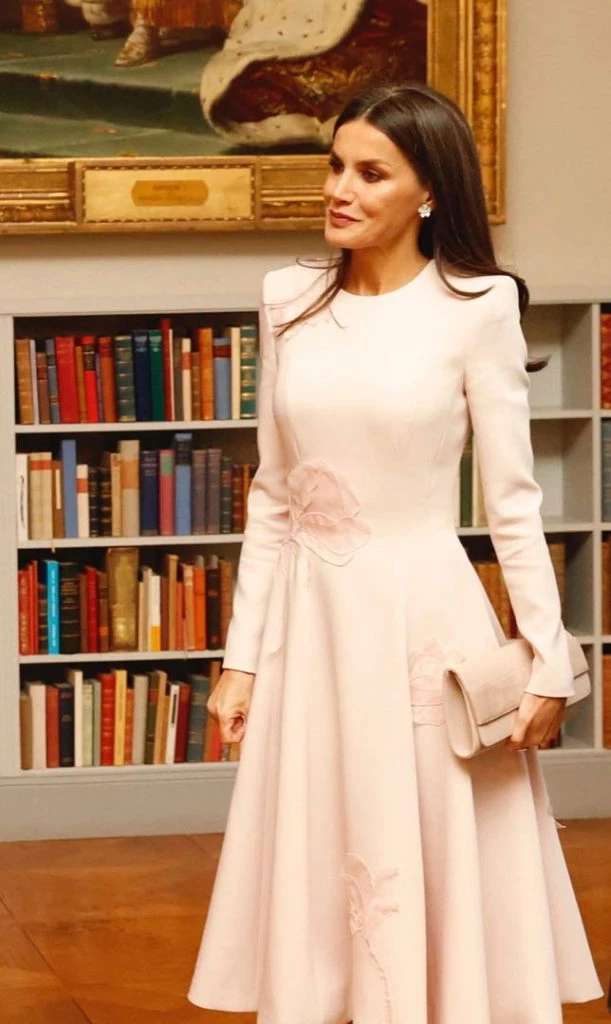La monarca hizo honor a su país y eligió llevar un vestido que lleva el sello de Pedro del Hierro, una marca española. Un diseño de color rosa pastel confeccionado en creppe con aplicaciones de flores de organza de seda con efecto 3D. Tiene además cuello a la base, mangas larga, cintura ceñida y falda plato de largo midi.