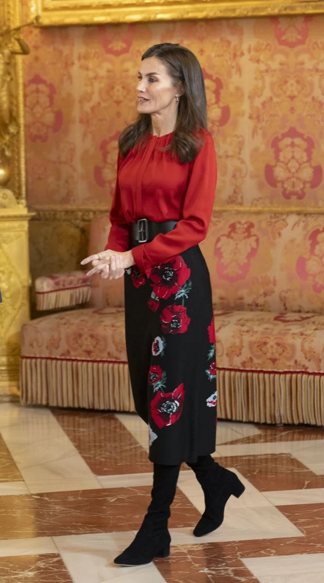 Para esta ocasión para la que la Reina eligio uno de sus estilismos más utilizados de su fondo de placard. En concreto, adoptó la pollera negra de largo midi con flores bordadas en rojo y azul de Carolina Herrera. Completó su look con una blusa de seda roja de Hugo Boss y en los pies llevó unas botas altas de gamuza con taco cuadrado.