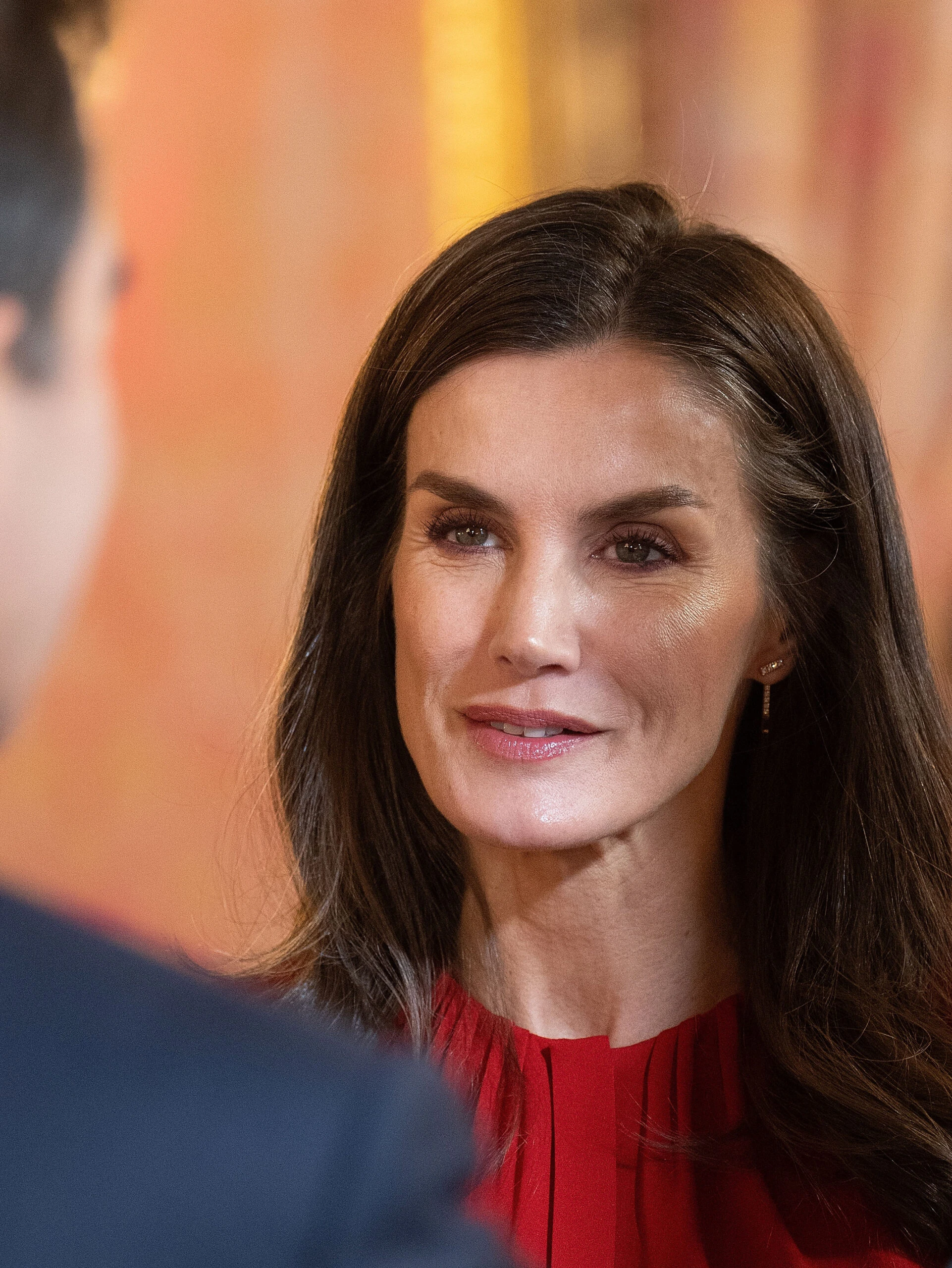 Esta mañana, la reina de España se reunió en el Palacio Real junto al rey Felipe VI con los miembros de la Fundación princesa de Girona y adoptó una de sus polleras favoritas qu etiene en su guardarropas.