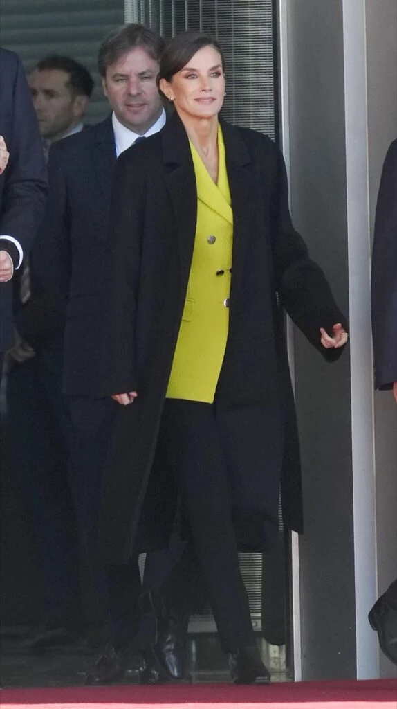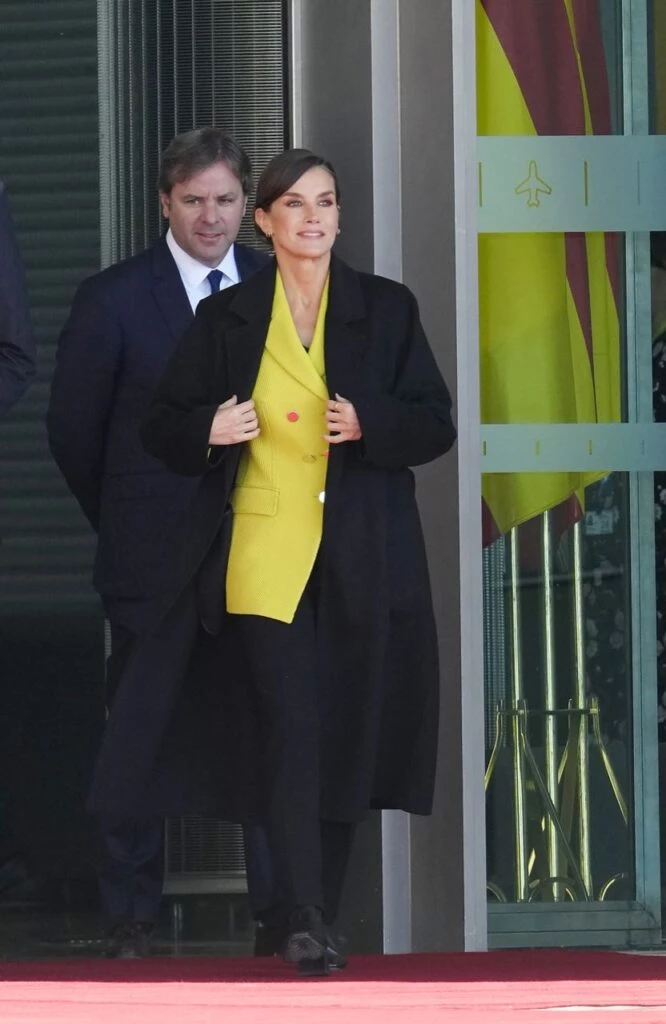 Para este viaje, la reina de España llevó un outfit cómodo, canchero y súper chic eligiendo un llamativo blazer en color amarillo y con textura, que llevaba bajo un abrigo negro, adecuado a las frescas temperaturas de Madrid.