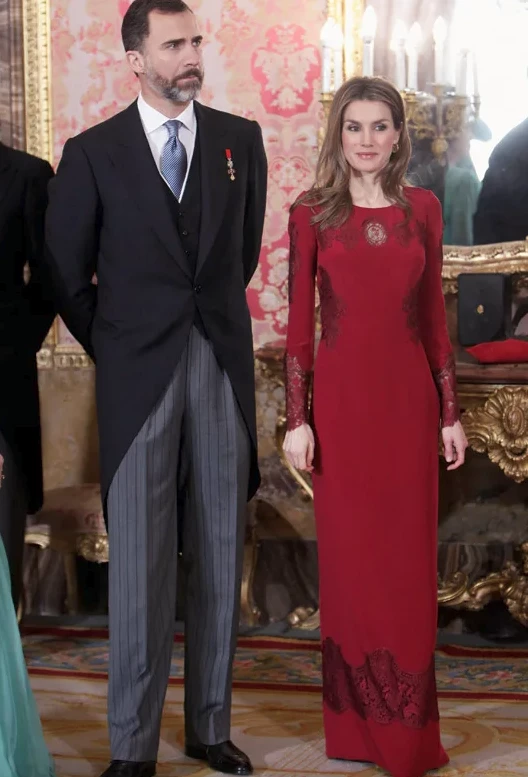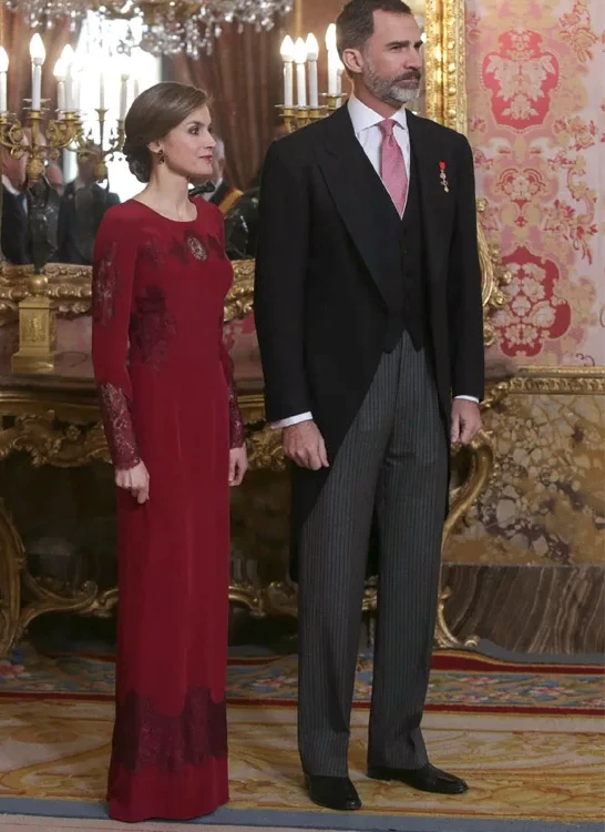 Sabemos que el rojo es el color favorito de la Reina de España y en esta ocasión recuperó de su guardarropas un vestido tubo largo al piso en tonalidad rojo marsala, del diseñador Felipe Varela.