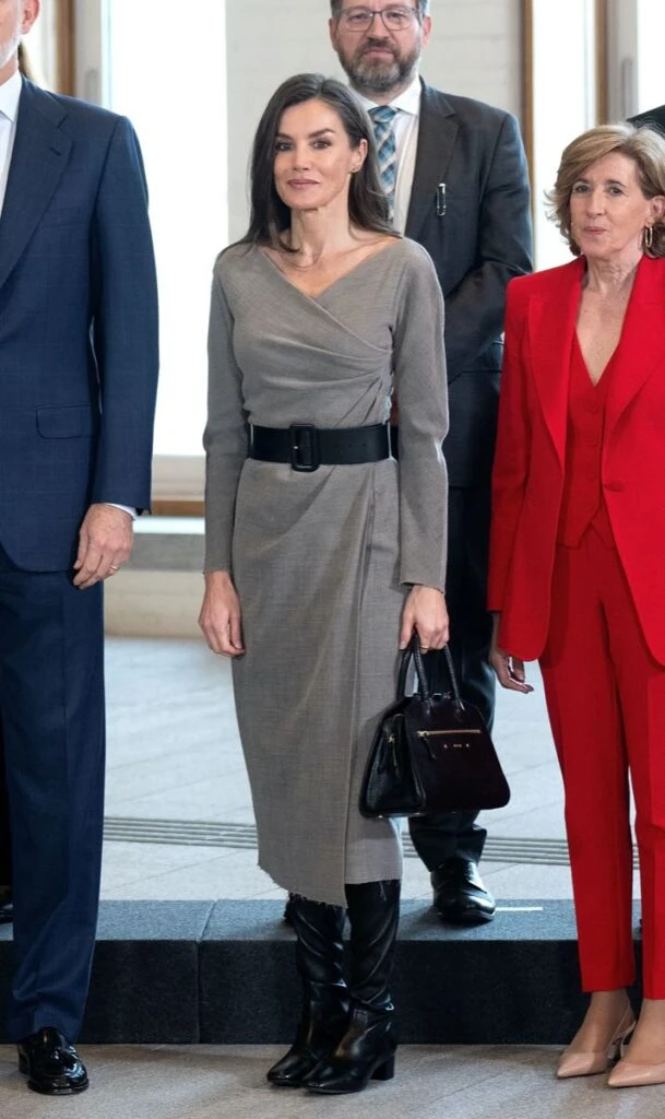 Para esta jornada laboral, la monarca lució un vestido midi de Cortana, firma que nació en 2001 en Palma de Mallorca, y que Letizia tiene en su placard desde hace dos años. Bautizado como Felicita, es un vestido confeccionado en un tejido de lana virgen elástico, con manga japonesa y un amplio escote en forma de V y drapeado central.