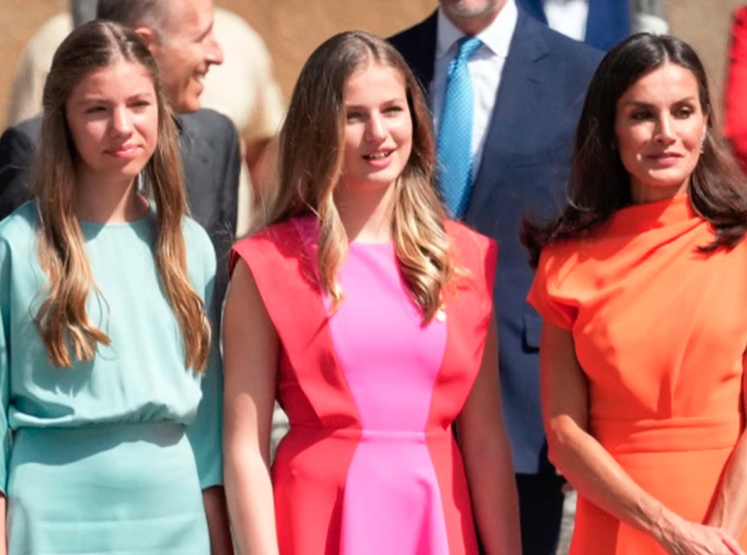Allí, las mujeres de la familia real española, apostaron por estilismo muy coloridos marcando tendencia en los tonos que serán protagonistas en el verano 2023: Letizia eligió un vestido naranja intenso, Leonor uno bicolor en fucsia y rojo, mientras que la menor Sofía prefirió un diseño en un color pastel coordinado con la corbata de su padre en alusión a la bandera gallega.