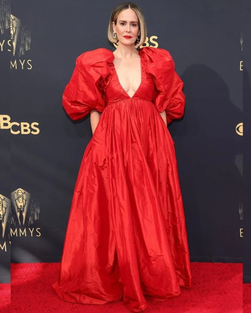 Sarah Paulson eligió el color rojo con un espectacular vestido de Carolina Herrera satinado, súper escotado y con mangas XXL.