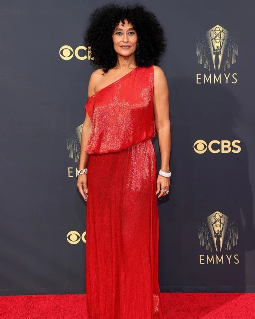 Tracee Ellis Ross llevó un look en rojo brillante con un solo hombro, de Valentino.