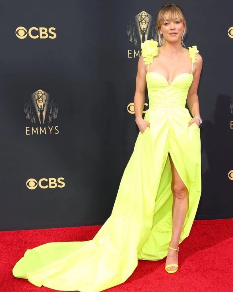 Kaley Cuoco brilló literalmente con un total look en neón, un diseño de Vera Wang.
