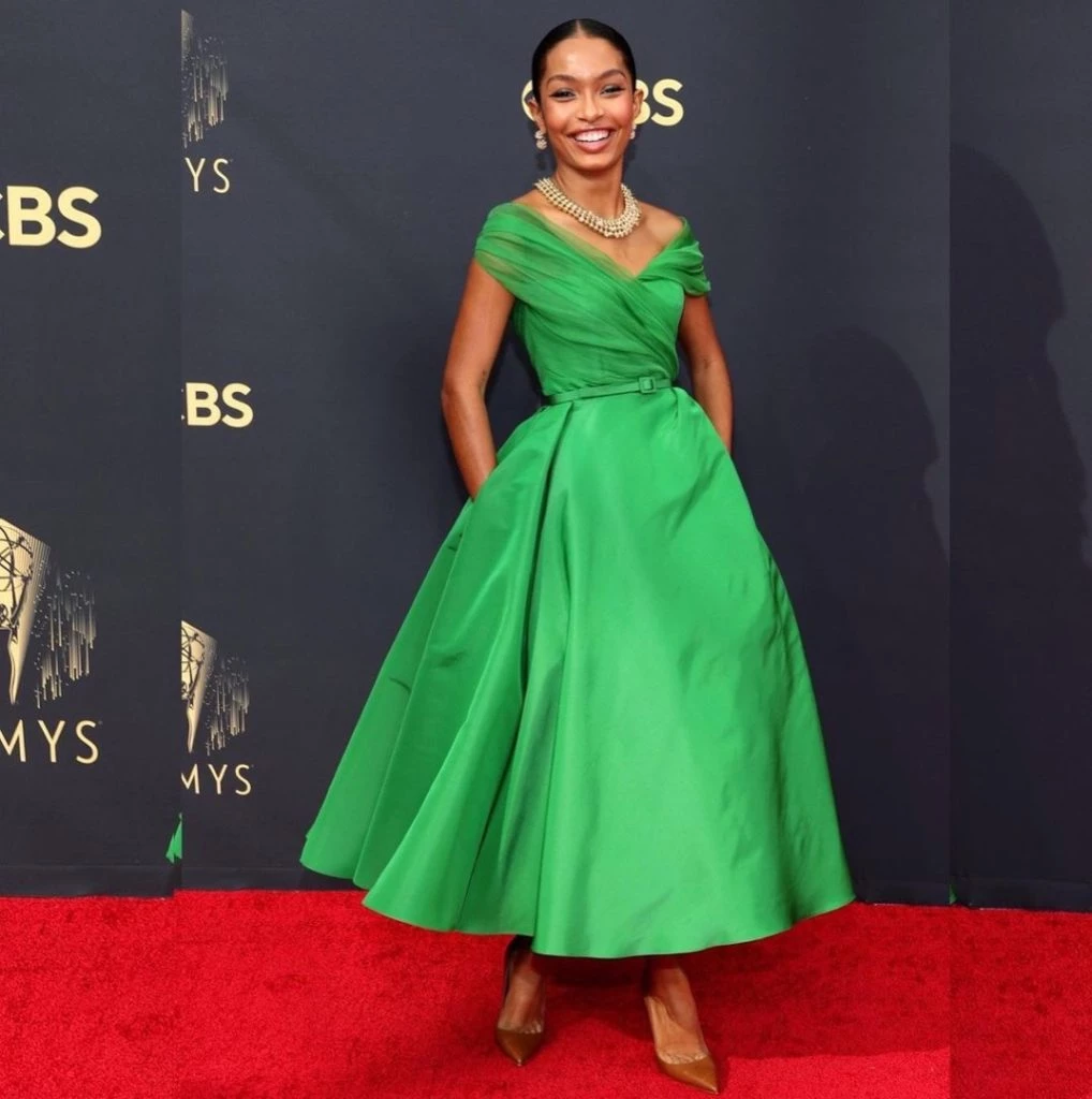 Yara Shahidi eligió el color de la temporada: el verde. Como embajadora de Dior, optó por un diseño de la maison francesa, con escote drapeado, cintura marcada y falda A. Completó con stilettos en color suela.