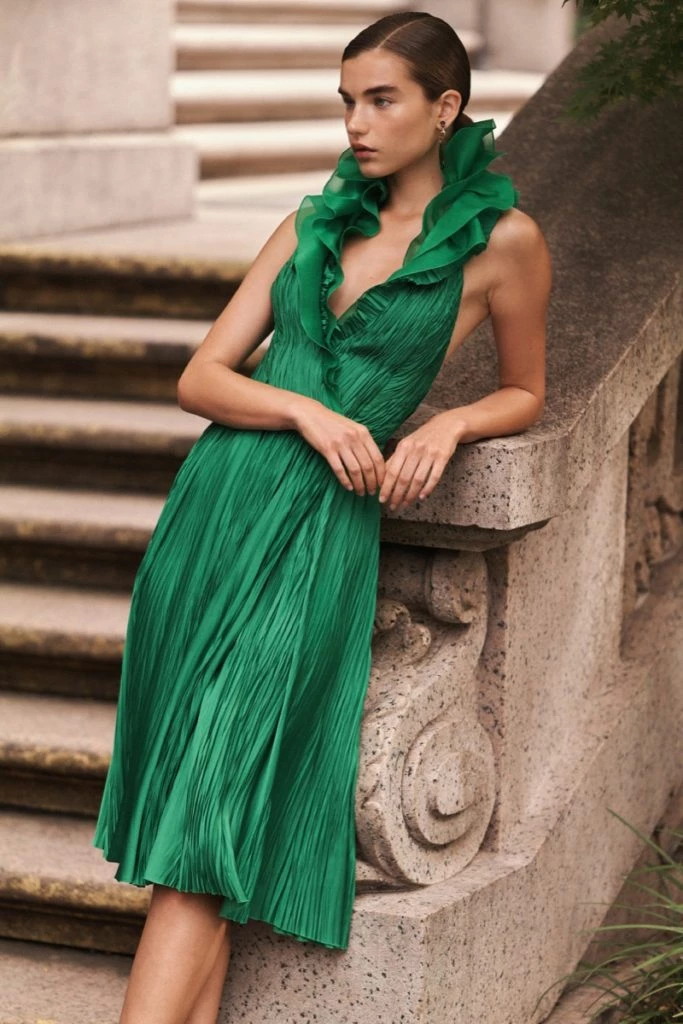 El verde esmeralda, el azul real y el amarillo agregaron alegría a su icónica sastrería, y en las blusas se sumaron suaves volados aportando altas dosis de feminidad.