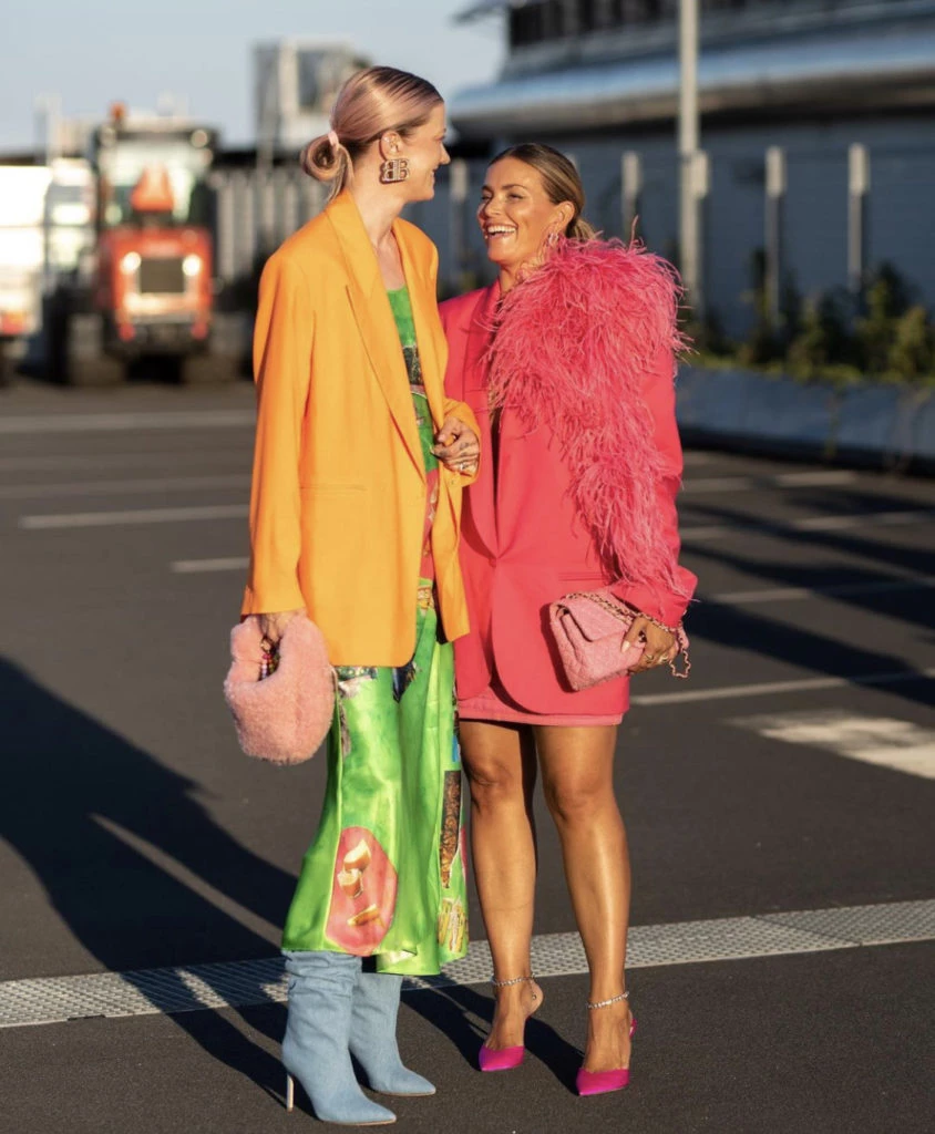 Marianne Theodorsen y Janka Polliani siempre lucen atuendos coloridos. Es parte de ellas y los combinan de formas poco común, de manera que pensamos que podían combinar. Como dijimos antes el fucsia, el naranja serán tendencia pero en el look de ambas el detalle está en los accesorios. Pollina con su cartera rosa Chanel y su estola de plumas. Marianne con sus aros Balenciaga y botas de denim.
