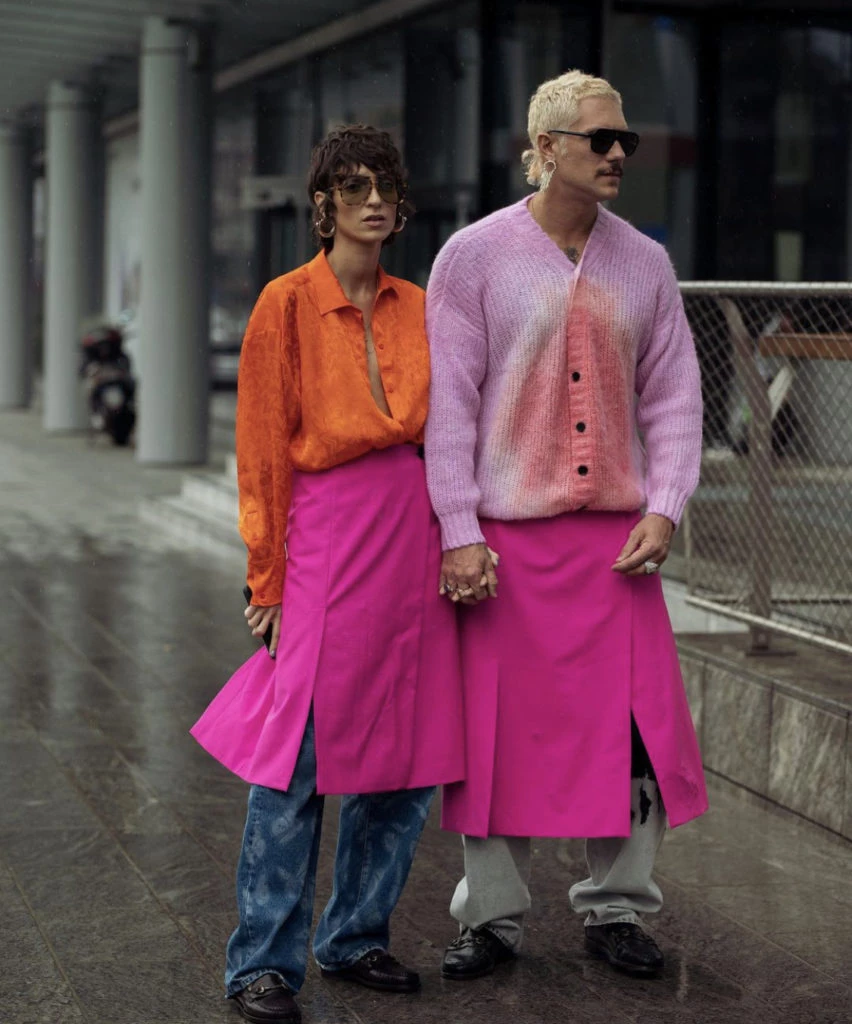 Usar vestidos y faldas sobre pantalones vuelve a estar de moda. Al igual que al comienzo de los años 2000. En la foto vemos dos atuendos similares y muy cancheros, en colores shocking.