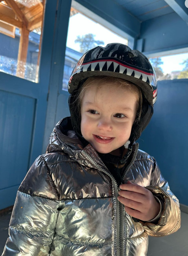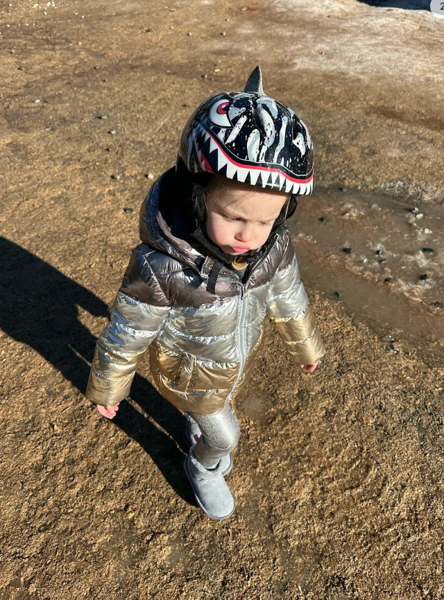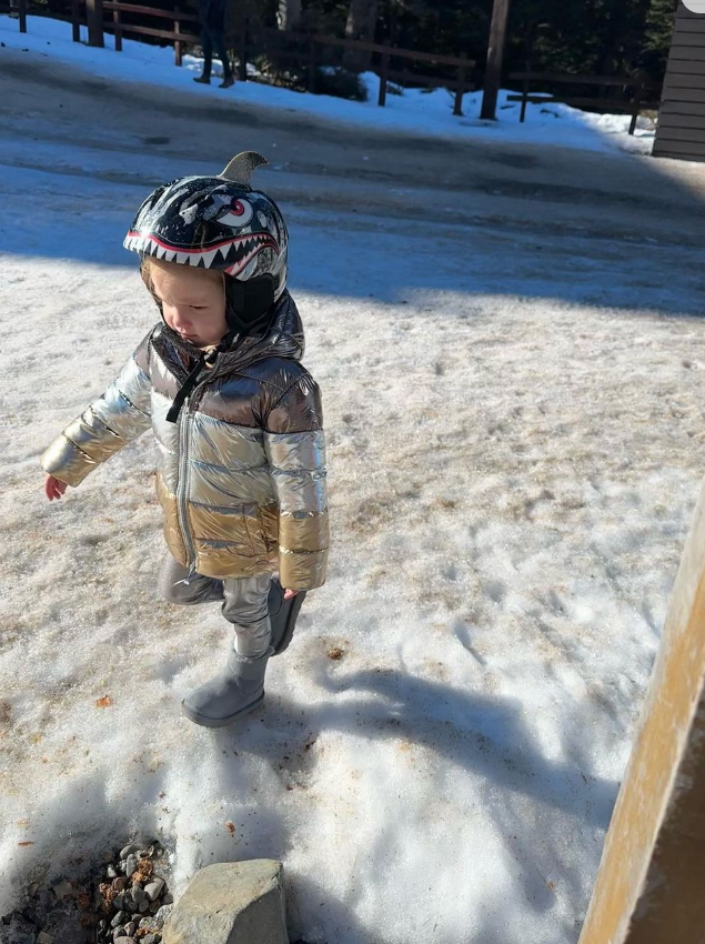 Al día siguiente, su look cambió por el plateado y el dorado con un outfit súper abrigado que incluía botitas en tono gris y casco con simpático detalle de tiburón bebé. En esta ocasión, Anita usó un pantalón metalizado en color plateado y una campera puffer al tono, que agregaba franjas en dorado.