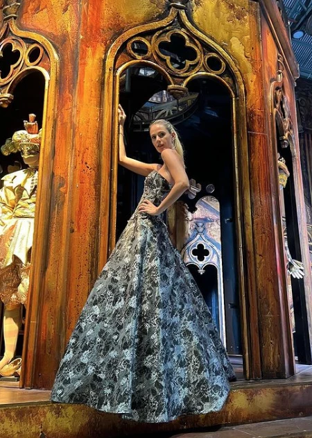 Rocío Vivas usó un vestido diseñado por Claudio Cosano, strapless, completamente bordado en celeste y gris.