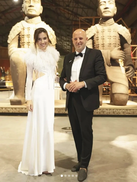 Mariana Genesio Peña se lookeó con un traje de pantalón y chaqueta diseñado por Jorge Rey, en color verde con arabescos bordados en dorado.