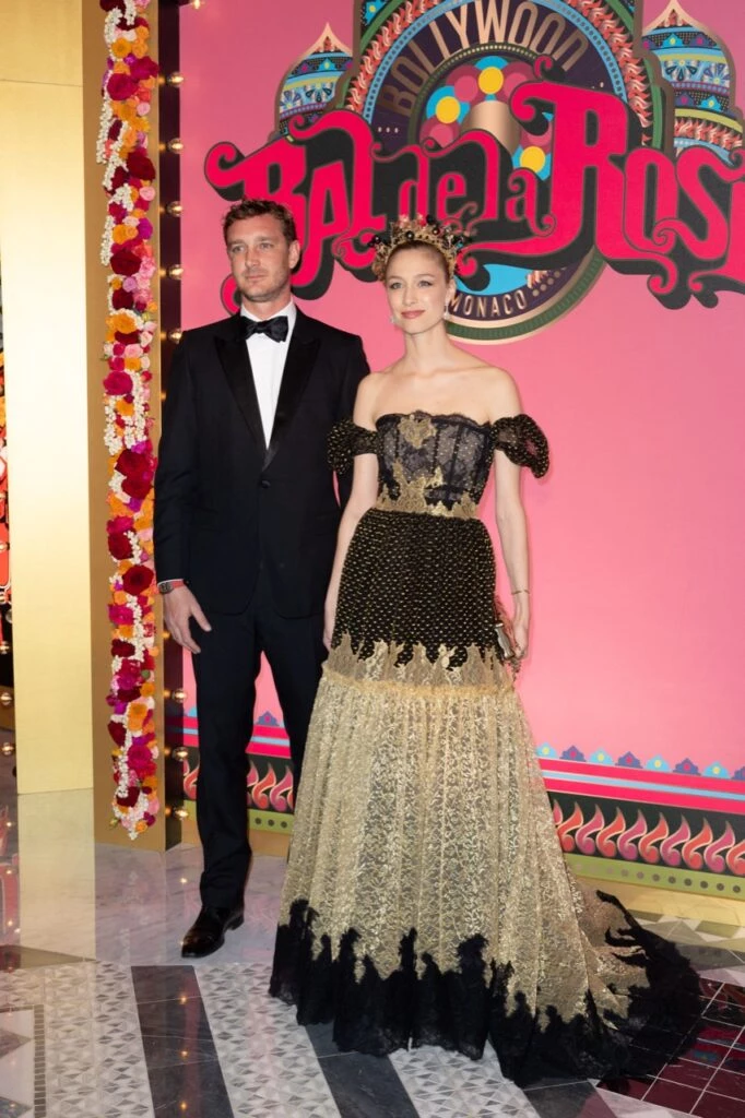 Beatrice Borromeo, esposa de Pierre Casiraghi, se destacó llevando un diseño de hombros al aire, línea al cuerpo y falda voluminosa, confeccionado en color negro y dorado, con motivos orientales. Completó su look con una tiara dorada.