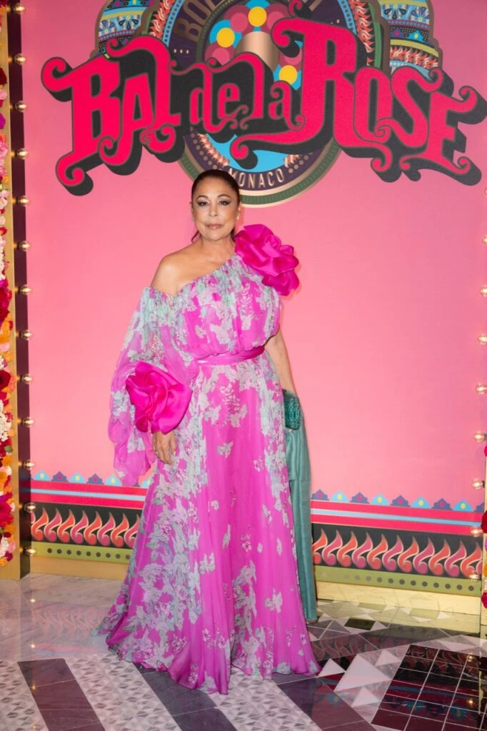 Quien también brilló este año en el Baile de la Rosa fue la cantante española Isabel Pantoja, que llevó un diseño de gasa en colores rosados, de un solo hombro y grandes flores aplicadas.