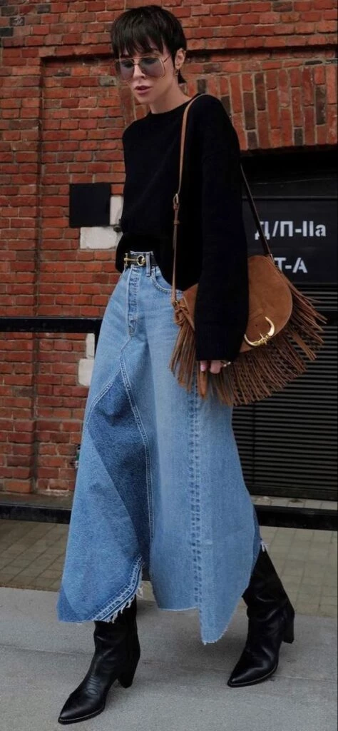 Una de las tendencias que reivindica 2000: las maxifaldas denim largas pisan con fuerza las calles y nos recuerdan a los looks de principio de siglo. Algunas las amarán y otras las odiarán, pero las vemos a ver sin parar. Se llevan con botas, zapatillas y hasta sandalias.