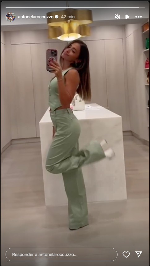A través de un posteo en sus redes sociales, la mujer de Leo Messi mostró su nuevo look compuesto por un conjunto sastrero de chaleco con espada al descubierto y pantalón ancho y recto en color verde menta.