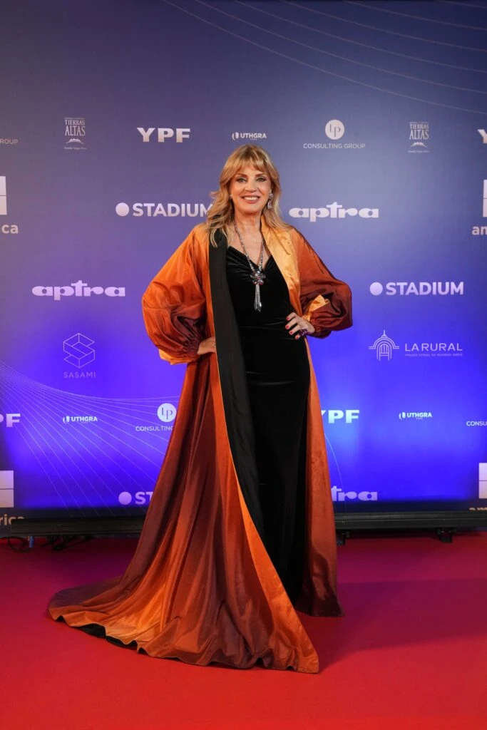 Por otro lado, Dominique Metzger, nominada por labor conducción femenina en radio también eligió el negro y llevó un vestido de Javier Saiach. Se trató de una pieza de mangas largas en terciopelo, con profuso bordado de cristales en azabache. Esta posee un elegante cuello tortuga y un escote en la espalda, que añade un toque de sofisticación y sensualidad.