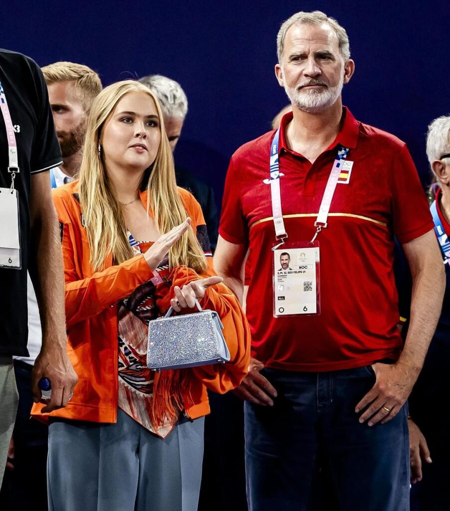En las últimas horas, Amalia lució un look con un guiño a los colores de su nación: llevó una campera naranja de los Juegos Olímpicos y una bufanda larga de seda de Hèrmes, que utilizó en forma de top. Además, lo combinó con unos pantalones amplios de color gris claro y como accesorio, usó una mini cartera plateada de brillos de Marina Raphael.