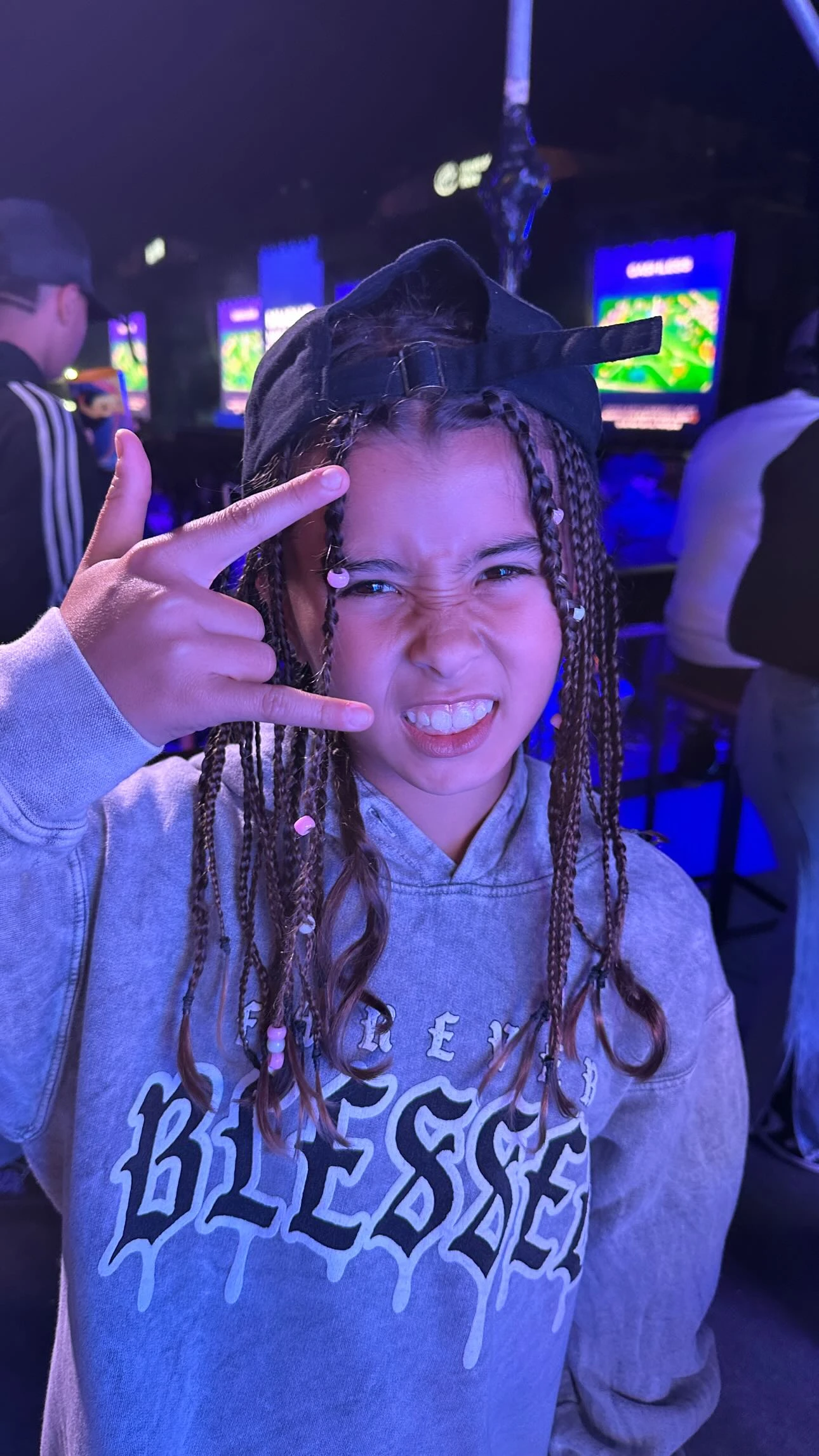Además, ambas niñas se lookearon para ir al festival donde demostraron todo su estilo. La hija de Nicolás Cabré lució un buzo gris estampado junto a una calza negra brillosa y zapatillas de Kitty. Además, llevó una visera negra y se peinó con unas minitrencitas con unas cuentas de varios colores.
