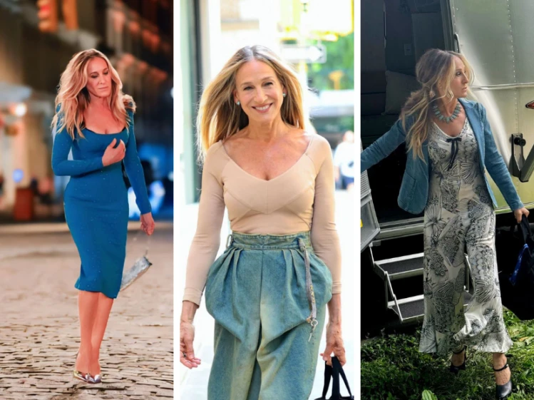 Es notable cómo continúa la vigencia de colores como el gris y el azul real. Repasaremos cómo usa los metalizados, el denim, las estampas de gran porte, los colores pastel, las transparencias y los zapatos Mary Jean, en diferentes looks de Carrie que nos brindan un panorama de lo que se viene para 2025.