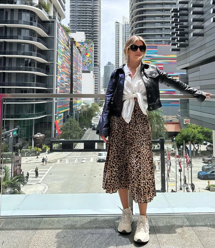 Laurita lució un estampado que nunca pasa de moda: animal print. Y lo usó en una falda plisada tiro alto que combinó con prendas básicas: camisa blanca y campera de eco cuero. Como toque fashionista, agregó zapatillas deportivas de color nude y anteojos de sol.