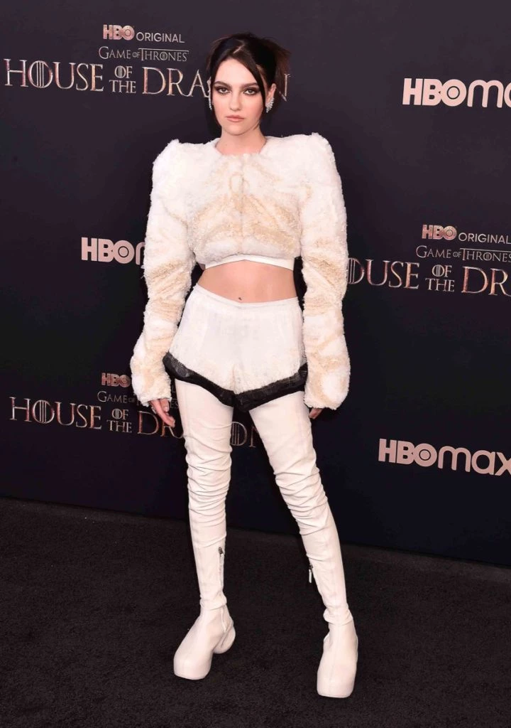 Por su parte, Emily Carey que interpreta a Alicent Hightower cuando era joven, llevó un osado y particular look de Givenchy que incluía una campera corta de piel, un short y unas botas bucaneras, todo en color off white.
