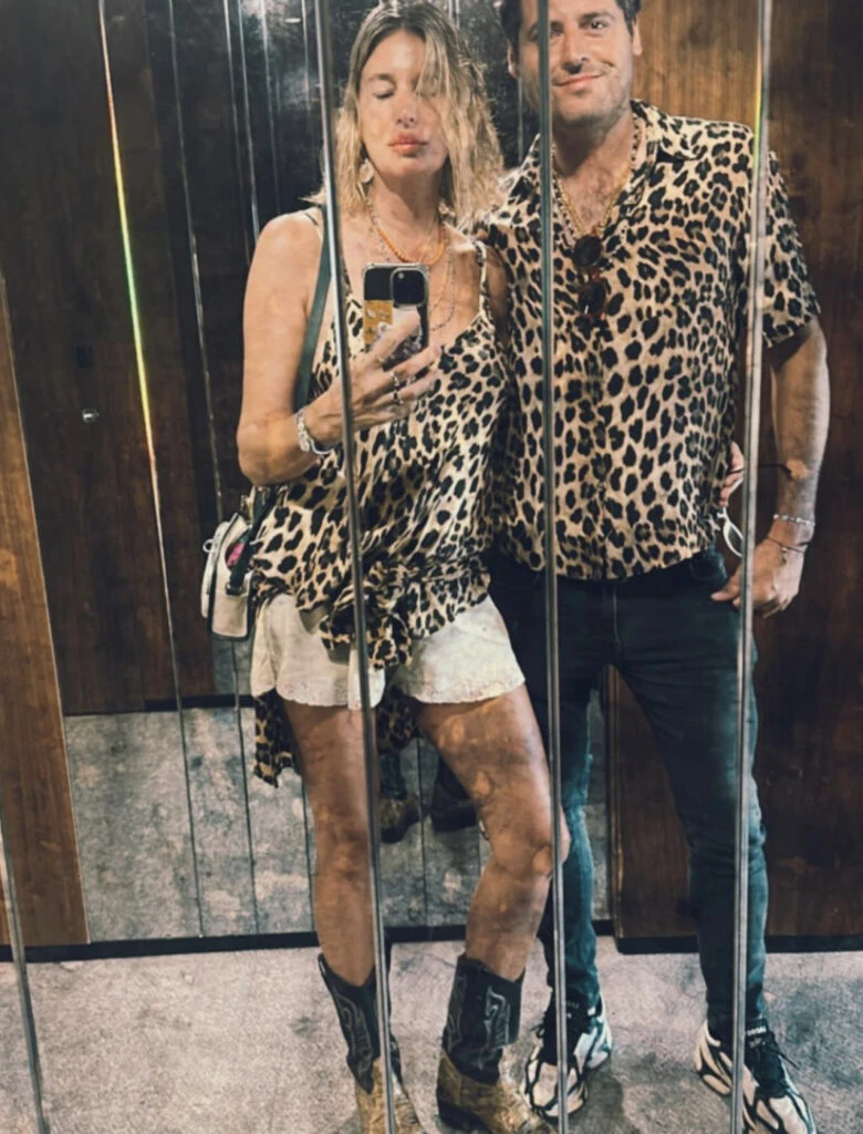 La modelo llevó un top de seda, shorts y botas texanas. Su novio usó una camisa del mismo estampado, jean y zapatillas. ¿El detalle? ambos apostaron por el animal print, el estampado más canchero de este 2024.
