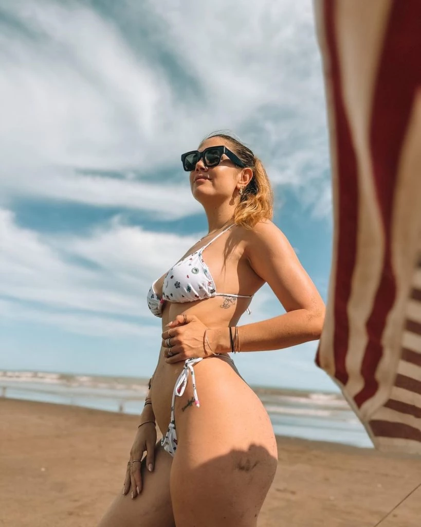 Por su parte, la actriz Mica Vázquez lució desde las playas brasileñas un conjunto compuesto por un top deportivo. Se trata de una bikini blanca con algunos dibujos de hojas y flores, en tonalidades azules y rosas.