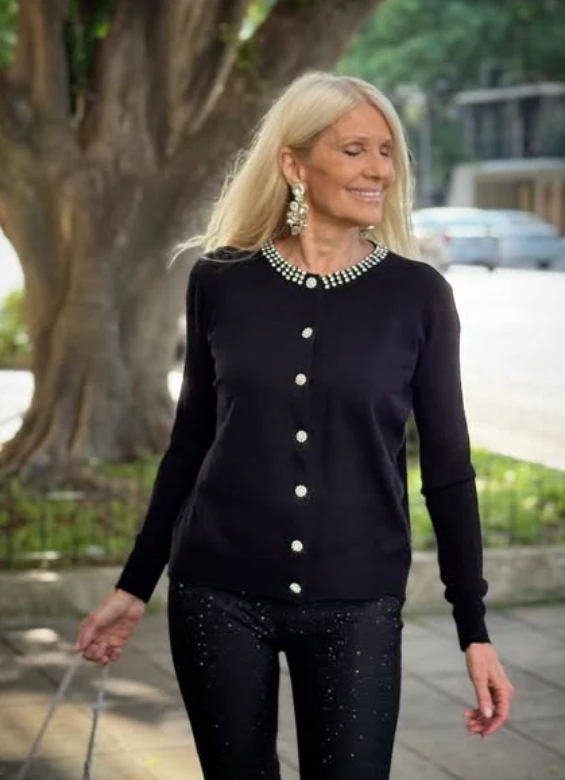 Por su parte, Evelyn apostó por un cárdigan negro con detalles de strass en el escote, un guiño directo a la firma francesa que revolucionó la moda femenina. Acompañó con un jean shinny y accesorios que iluminaron su outfit.