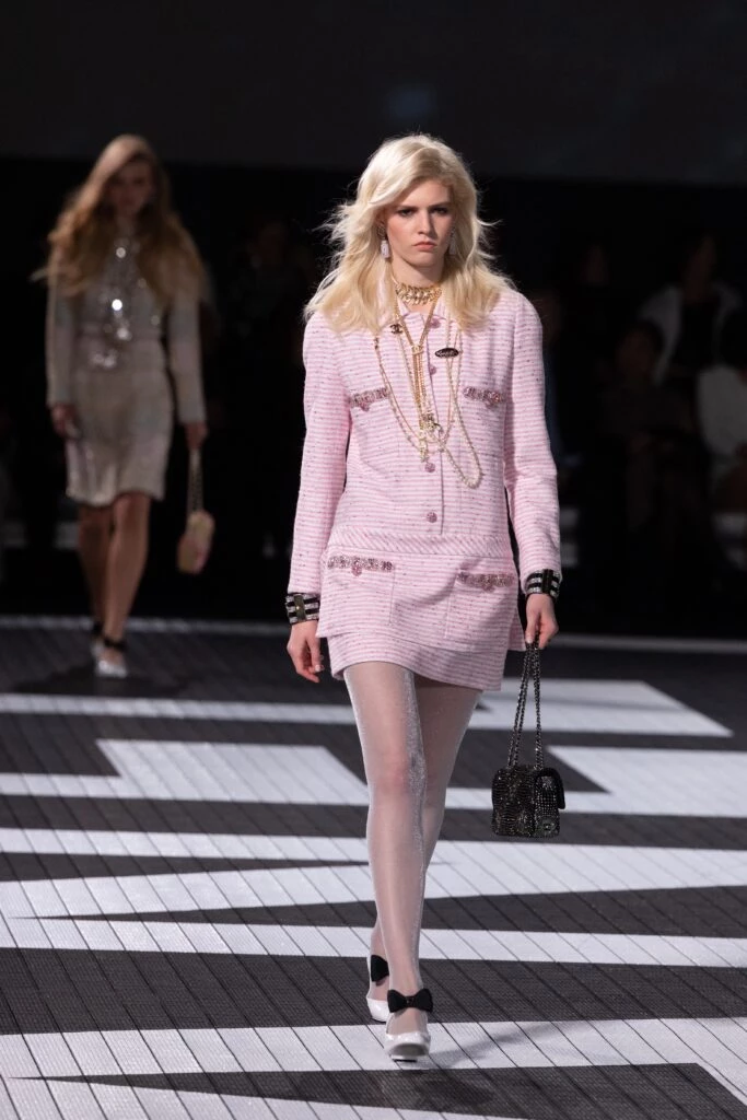 Desde outfits deportivos de los años 80 hasta estilismos de noche que nos remontan a la era dorada de las actrices de Hollywood, tal como lo vemos en las fotografías en las que los minivestidos de tweed o en tejidos brillantes se llevan con zapatos clásicos y femeninos.