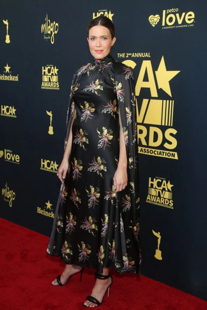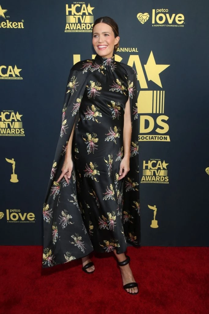 Mandy Moore, embarazada de su segundo hijo eligió un vestido de inspiración oriental. Un diseño con capa y estampa floral de la firma Rodate. Lo combinó con sandalias negras y llevó el pelo recogido.