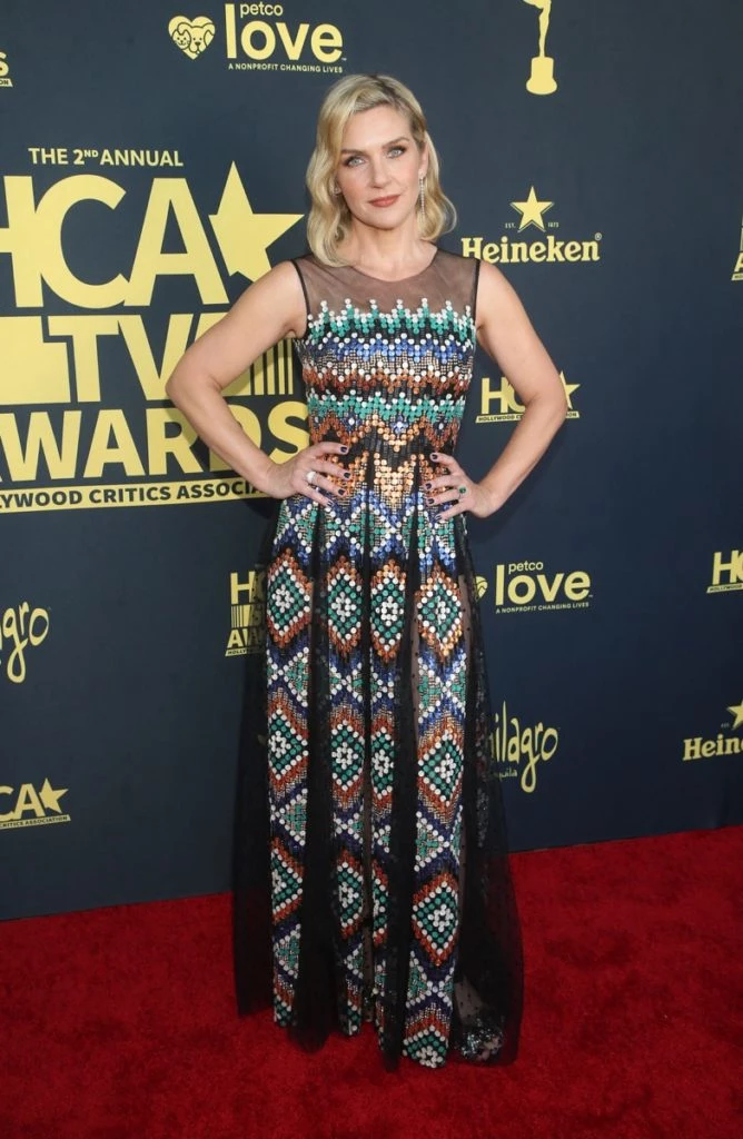 Rhea Seehorn adoptó un look étnico con un vestido con transparencias y mucho color.