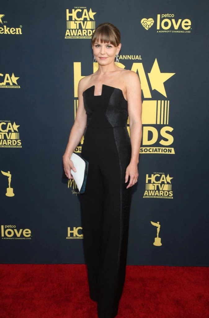 Muy elegante Jennifer Morrison adoptó un mono straplesss de color negro. Para darle un toque más chic a su look, sumó un clutch de color blanco.