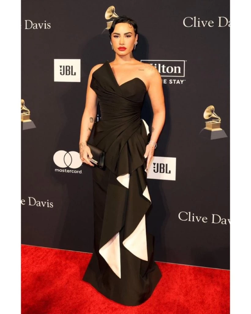 Quien también apostó por un total black fue Doja Cat. La rapera estadounidense llevó un vestido de Versace, con estela dominatrix. Por su parte, la ex Disney Demi Lovato optó por un vestido negro y blanco, con corte asimétrico, del diseñador vienés Rubin Singer.