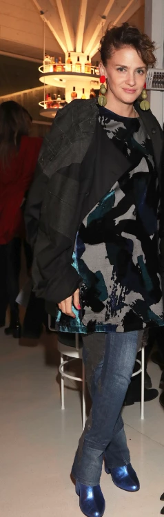La actriz Leonora Balcarce se jugó por las superposiciones. LLevó un abrigo oversize, un vestido mini con estampa metalizada, jeans azules con botamanga súper ancha. Completó su outfit con aros grandes de color y unas botas en celeste metalizado.