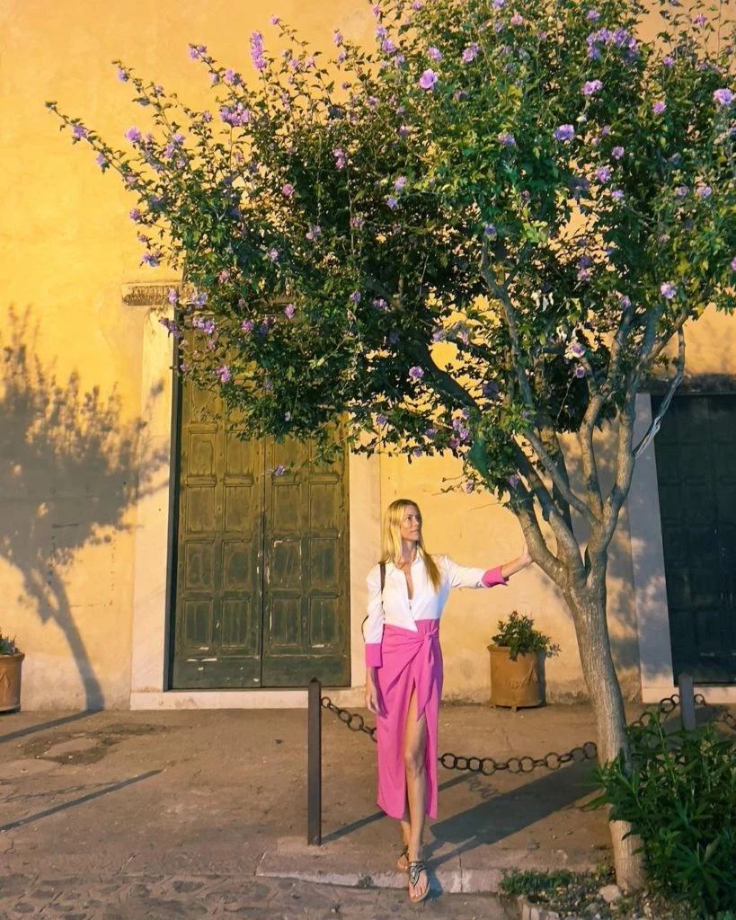 Además, la modelo demostró que es fanática del color rosa y se suma también a la tendencia Barbicore. A través de varias fotografías tomadas en la ciudad de Ravello, la pareja de Urcera lució un bellísimo vestido camisero cruzado bicolor y con abertura, dejando lucir sus piernas. Esto no fue todo ya que la modelo se animó a otro conjunto rosa, muy al estilo Tini Stoessel.