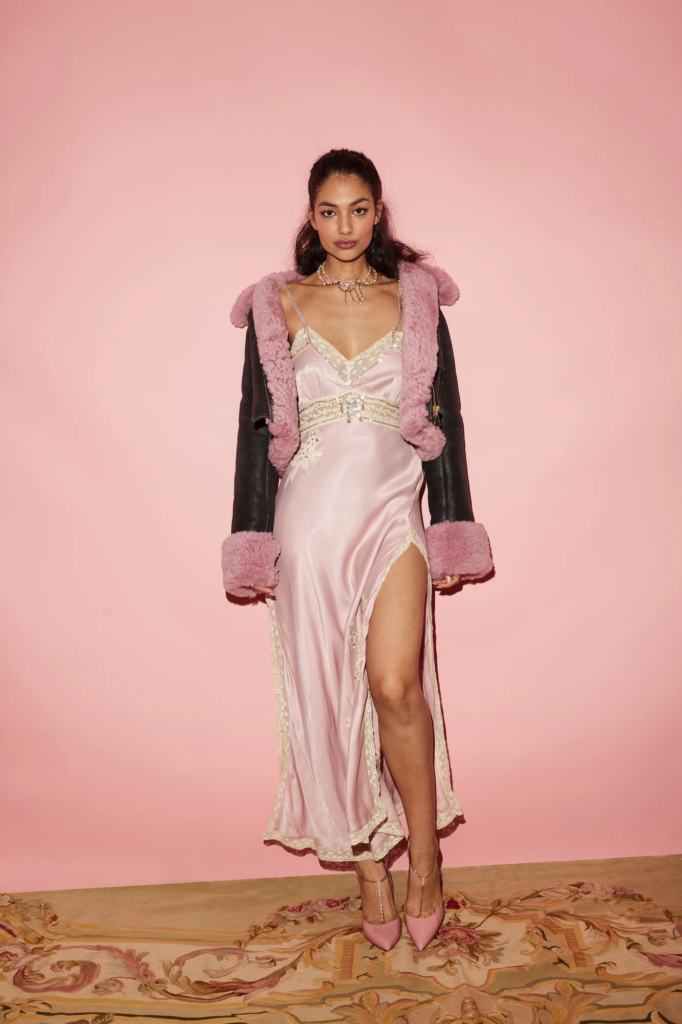 Pero la colección no ofrece nada más un vestuario de princesas: equilibra a la perfección el encanto femenino con piezas llamativas y audaces, ejemplificado por la armoniosa interacción de tonos rosados en vestidos románticos con negros y ciruelas oscuros que contrastan en camperas de cuero, aportando un toque de misterio e intriga a una paleta dominada por los colores más femeninos.