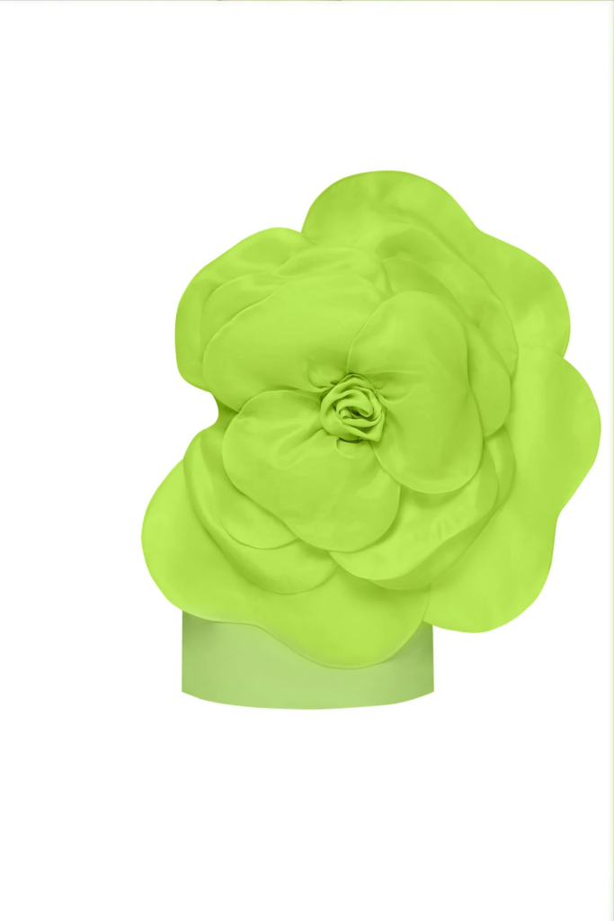 El vestido elegido por Luisana es de un llamativo color verde fluorescente. Con silueta de mini dress y escote strapless, el gran protagonista del vestido es la enorme flor que lo cubre casi totalmente. El detalle floral cuenta con varias capas que aportan dinamismo y movimiento a la prenda.