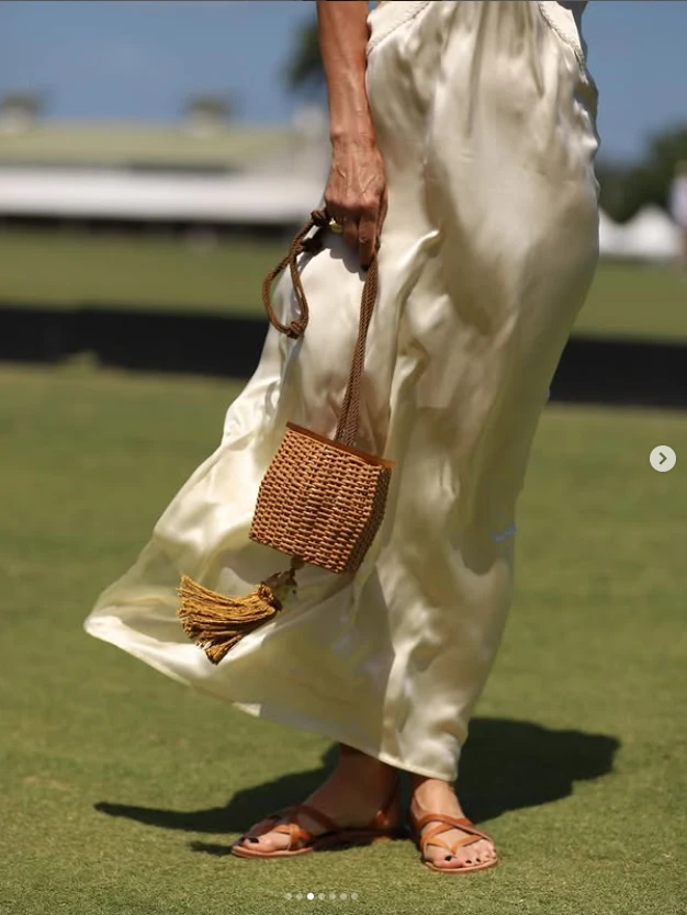 Para completar su outfir llevó accesorios que suman textura y carácter al estilismo. Por un lado llevó una cartera de rafia rígida, tipo baúl, con manija de madera y un gran tassel amarillo que le da un giro lúdico y artesanal. En los pies adoptó unas sandalias planas en tono suela, de tiras finas cruzadas, que refuerzan el aire descontracturado y veraniego.