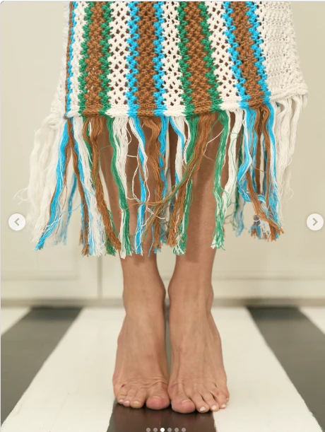 Y Mariana Fabbiani lo sabe. En las imágenes que compartió, luce un diseño tejido a crochet en tonos crema combinados con azul, verde y tostado, con flecos en la falda y una moldería simple que deja que el protagonista sea el propio material.