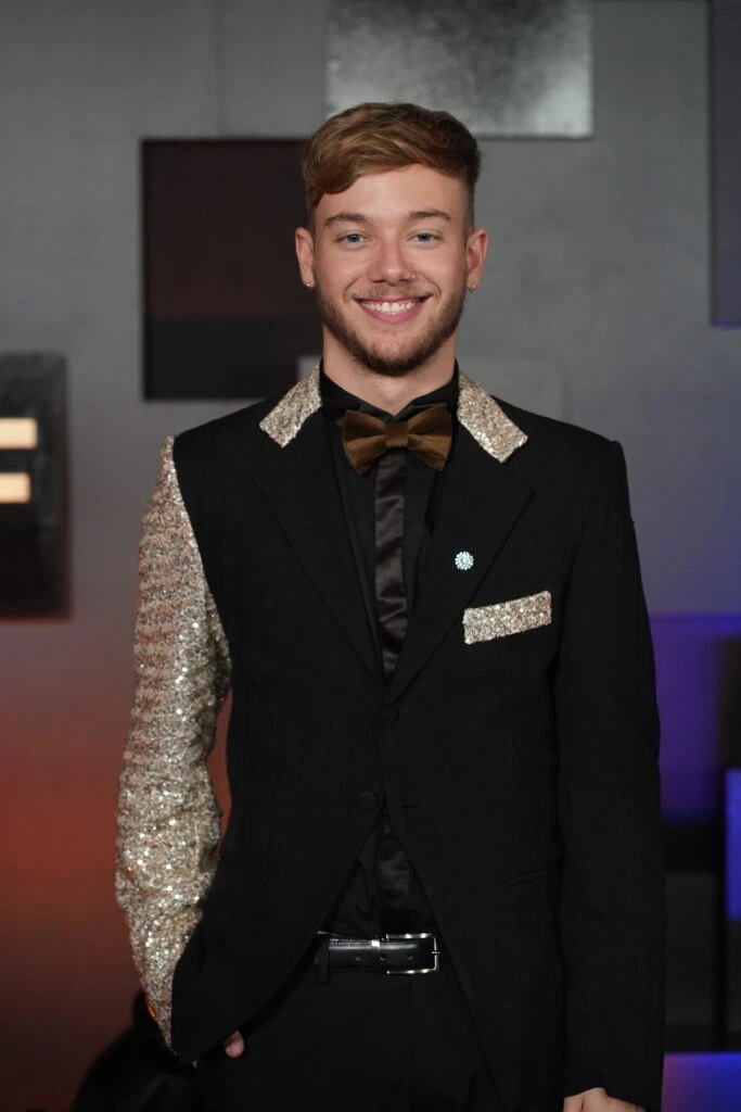 Nacho Castañares usó un look original de brillos y tachas. El subcampeón de Gran Hermano 2022 eligió un look un esmoquín diseñado por Daniel Casalnovo. Un original conjunto con un saco con una manga, cuello y bolsillo de lentejuelas. Completó con zapatos con tachas.