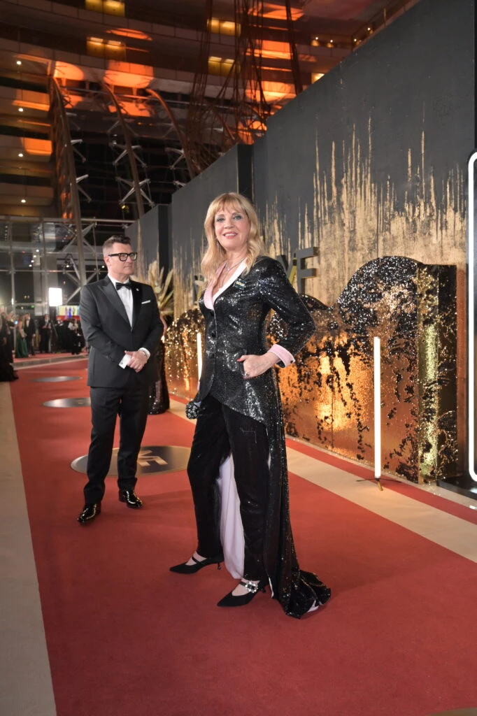 Susana Giménez llevó un vestido ajustado en color negro con aplicaciones de guardas y estrellas en plata y dorado. La acompañó su hija, Mercedes Sarrabayrouse, que vistió un diseño rojo con strapless y volados como mangas.