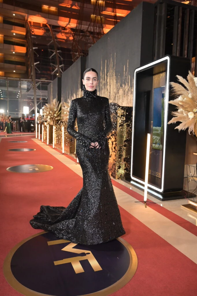 Agustina Cherri y Muna Pauls fueron vestidas por la estilista Vicky Miranda. La actriz llevó un diseño de Ramírez a medida, compuesto por falda con cintura alta de mikado de seda natural, body, escote bote de terciopelo elastizado y cinturón con moño. Completó el look con aros en oro blanco 18k y diamantes round cout y pear shape, son parte de la nueva colección de alta joyería de Simonetta Orsini. Muna Pauls llevó vestido elastizado negro de Mija y sandalias Ricky Sarkany.
