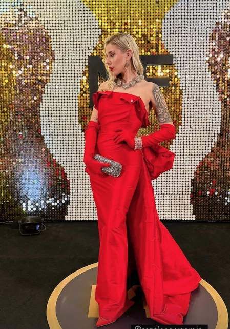 La Tora adoptó un look muy old Hollywood by Santiago Artemis. Un diseño columna en color rojo en shantung de seda con escote strapless y una amplia cola con gran moño . Sumó unos guantes al tono y un clutch con brillos.