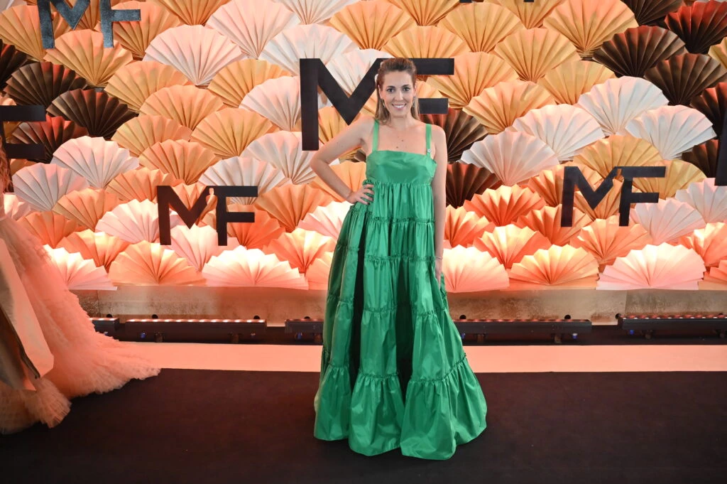Noe Antonelli llevó un vestido de vuelos cosidos en tafetán verde brillante de Adrián Brown.