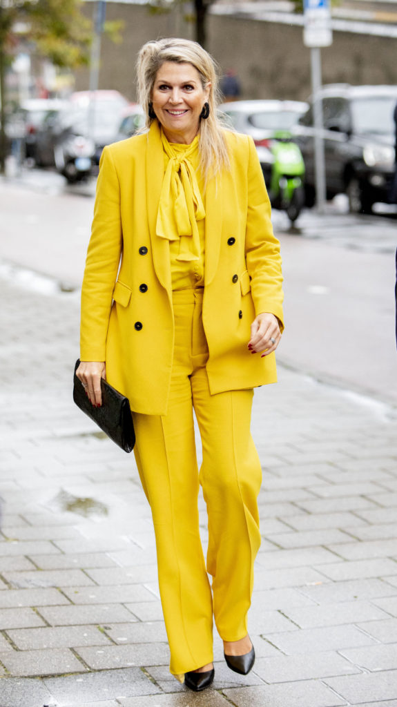 Máxima es amante de los colores y para este compromiso decidió usar un traje monocolor de saco cruzado con botonadura negra y pantalón acampanado que lo adquirió en el año 2019. Complementó su look con una camisa de gasa a tono con lazo en el cuello.