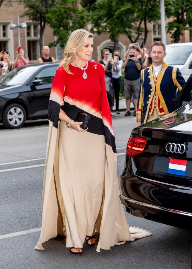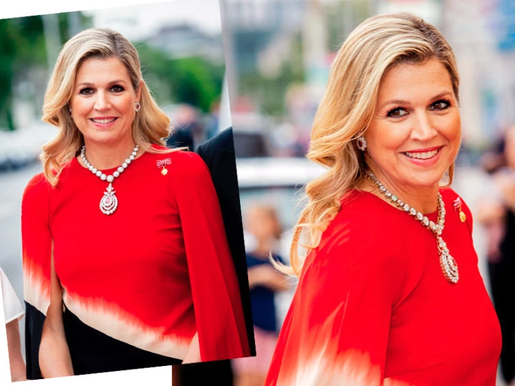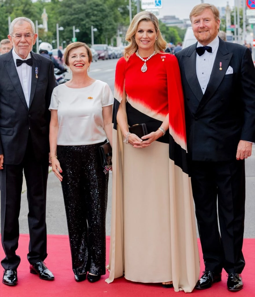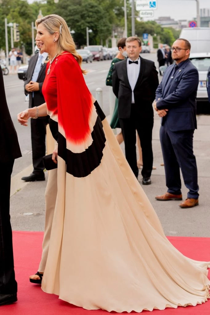Durante su visita oficial a Austria junto a su marido, el rey Guillermo, Máxima Zorreguieta nos deslumbró con cada estilismo elegido. Su glamorosa valija llena de color nos mostró looks espectaculares que van desde un vestido corto rojo, otro largo de escote asimétrico, uno más clásico de encaje celeste y por último este impactante vestido capa de tres colores.
