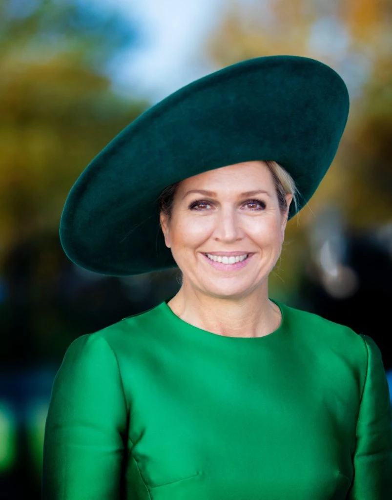 La reina holandesa visitó las nuevas oficinas de AFAS Software y para ello adoptó un estilismo de pies a cabeza en color verde, el tono estrella de este temporada.