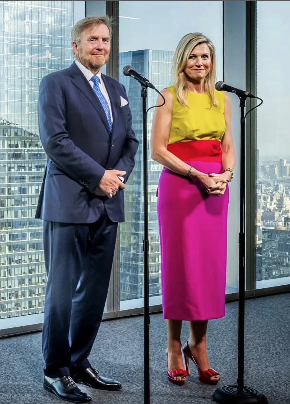 En esta ocasión, Máxima adoptó un vestido con alto impacto visual. En concreto se trató de un vestido realizado en crepé, de silueta columna, sin mangas, con cuello redondo y faja con moño. Su particularidad es que mezcla colores muy potentes. La parte superior es mostaza, la falda es magenta, y en el centro, uniendo ambas tonalidades, se encuentra el rojo.
